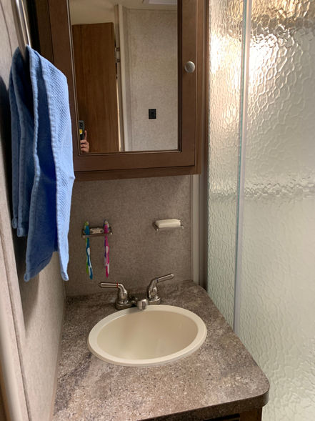 There is ample storage above and beneath each bunk, under the dining benches, in the bathroom closet, under the tv, as well as above and below the sink. The kitchen includes everything you need from the cutting board atop the sink, to the microwave, to a propane oven for baking! A starter set of dishes is included.